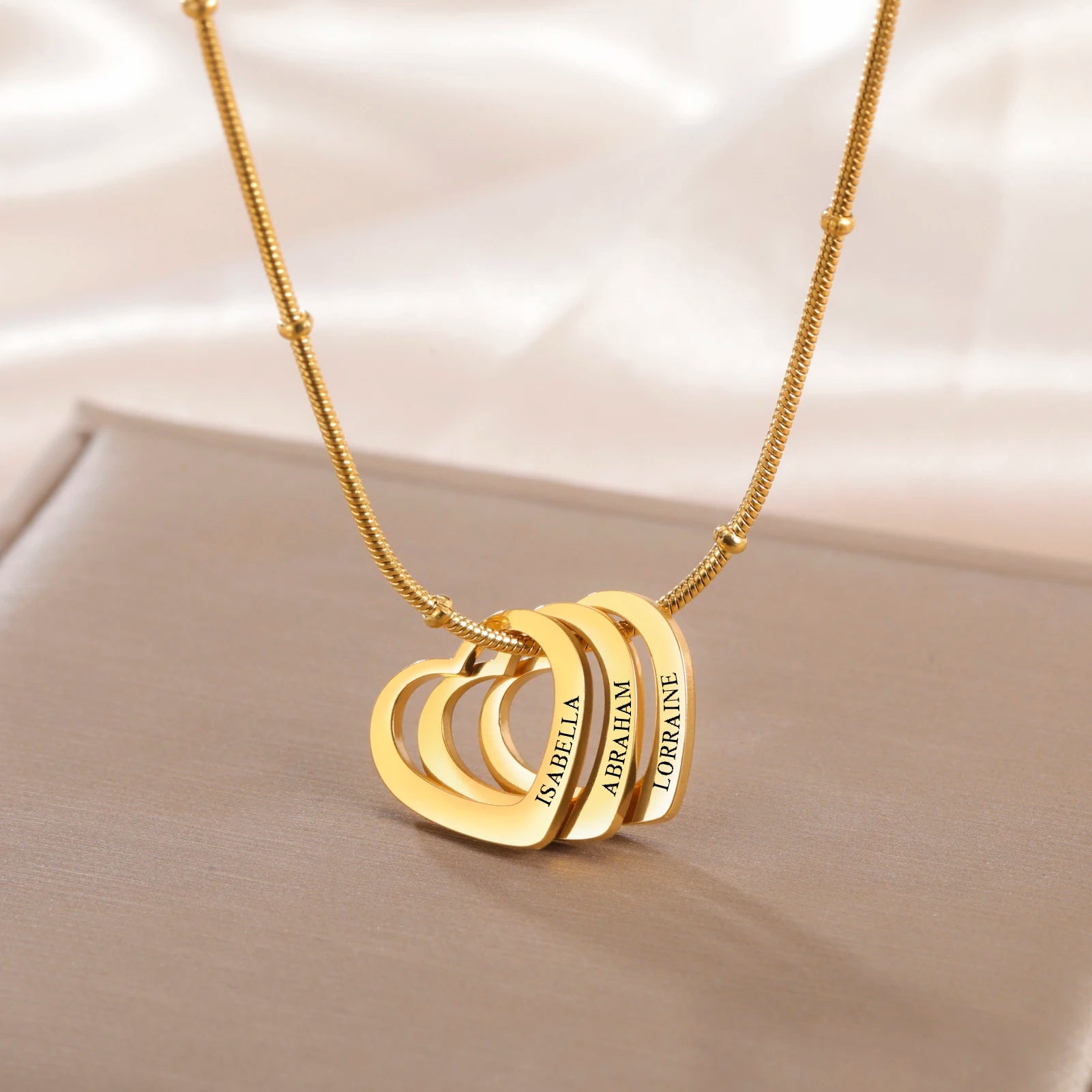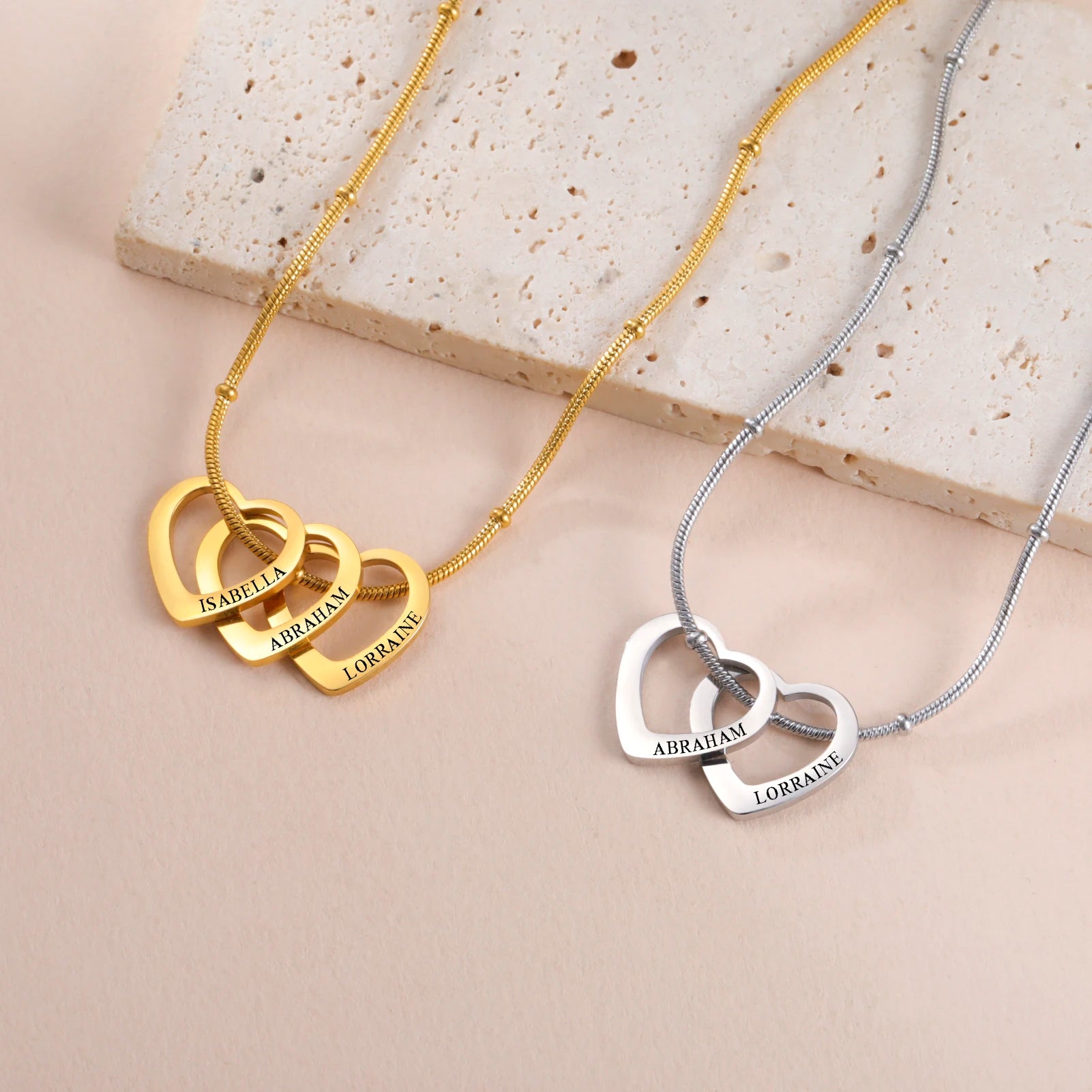 Mit der Lemegeton Herz-Halskette tragen Sie die Menschen, die Ihnen am meisten bedeuten, immer ganz nah bei sich. Die ineinander verschlungenen Herzen stehen für Liebe, Vertrauen und ewige Verbundenheit. Jedes Herz kann mit einem Namen Ihrer Wahl graviert werden – ideal für Kinder, Partner oder Familienmitglieder.